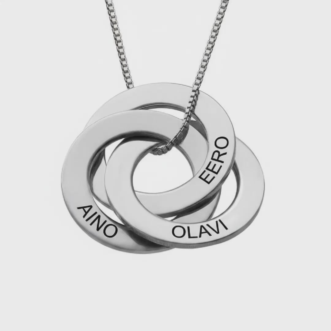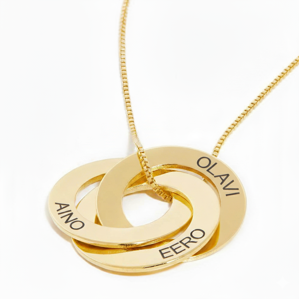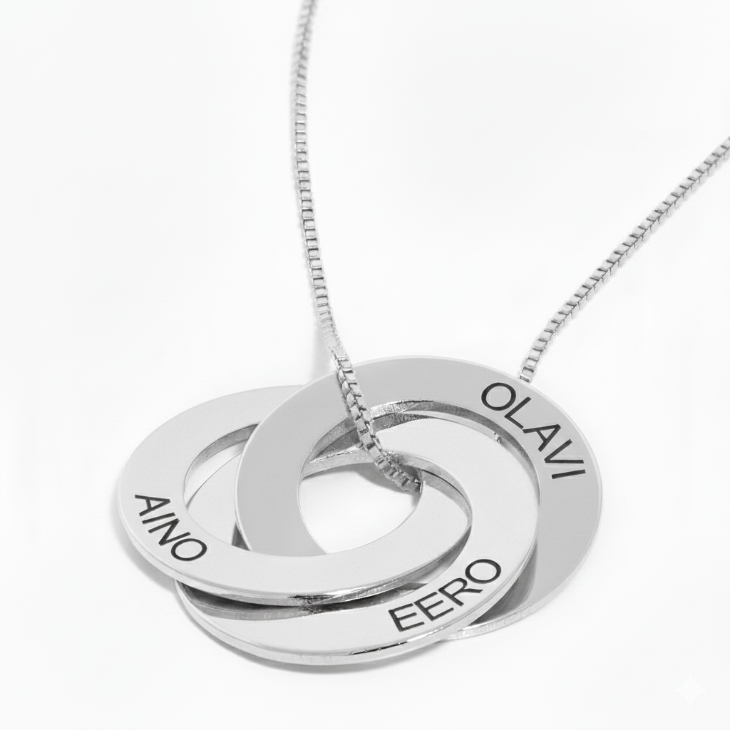 Kietoutuvat renkaat kaulakoru on täydellinensti yksilöity, ainutkertainen koru, joka tuo taatusti hymyn hänen kasvulleen. Tässä upeassa korussa on 2–5 yhteen kietoutuvaa rengasta. Jokainen rengas on kaiverrettu perinteikkäillä isoilla kirjaimilla.